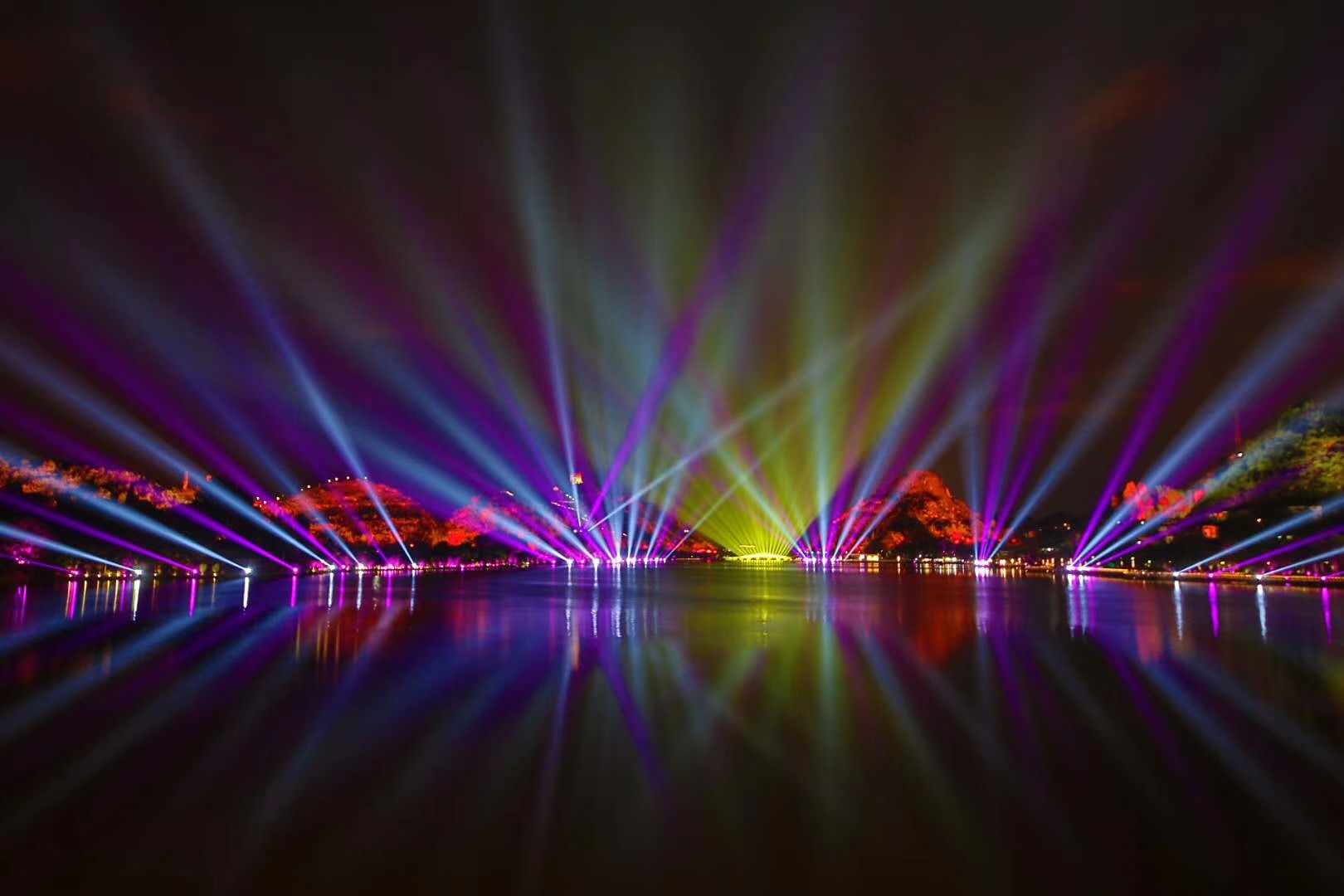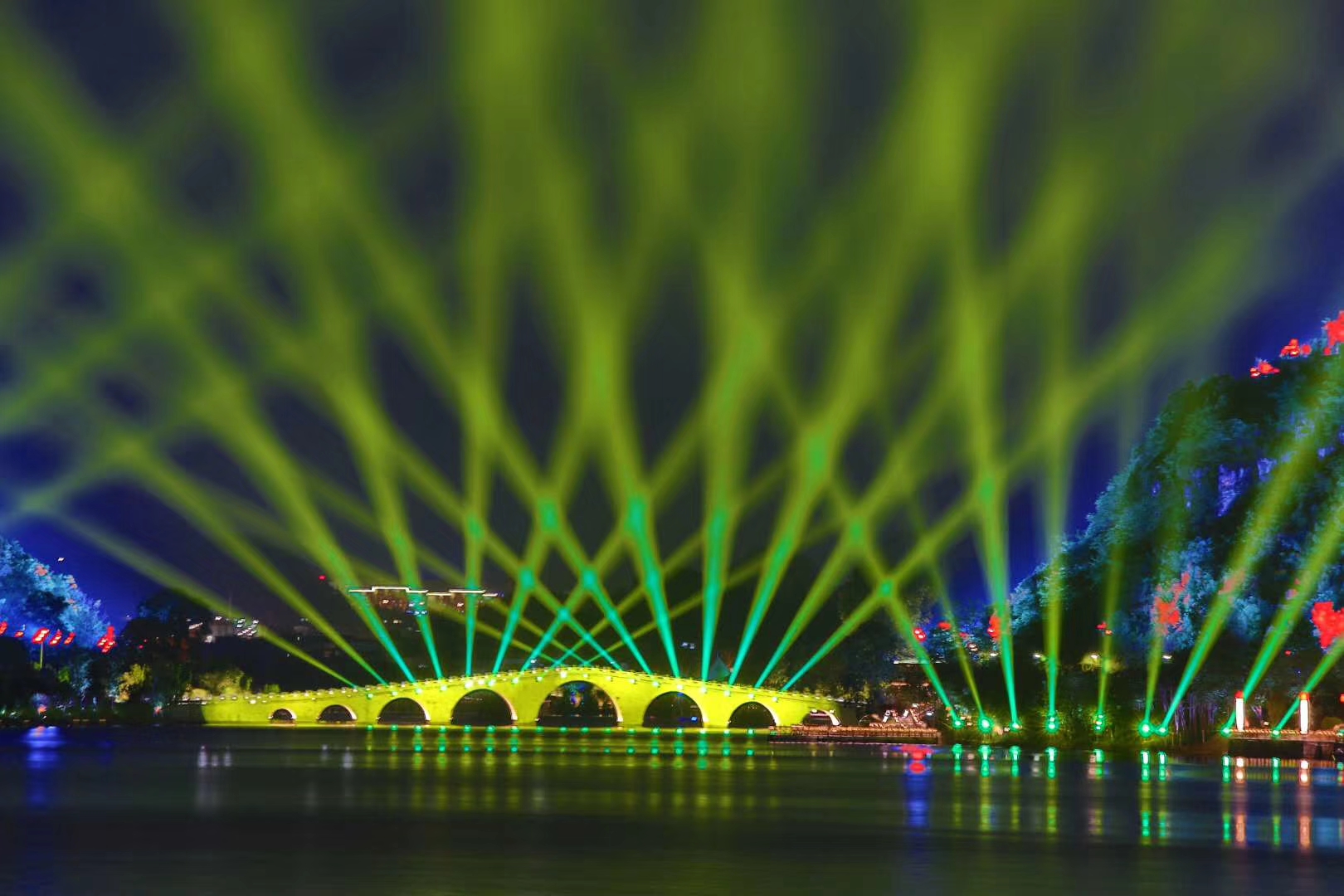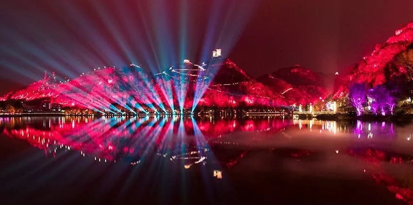 浩洋燈光璀璨點(diǎn)亮貴州安順虹山湖,以藝術(shù)與科技的完美融合打造大型山水湖景燈光秀《明鑲西秀 意寫江南》